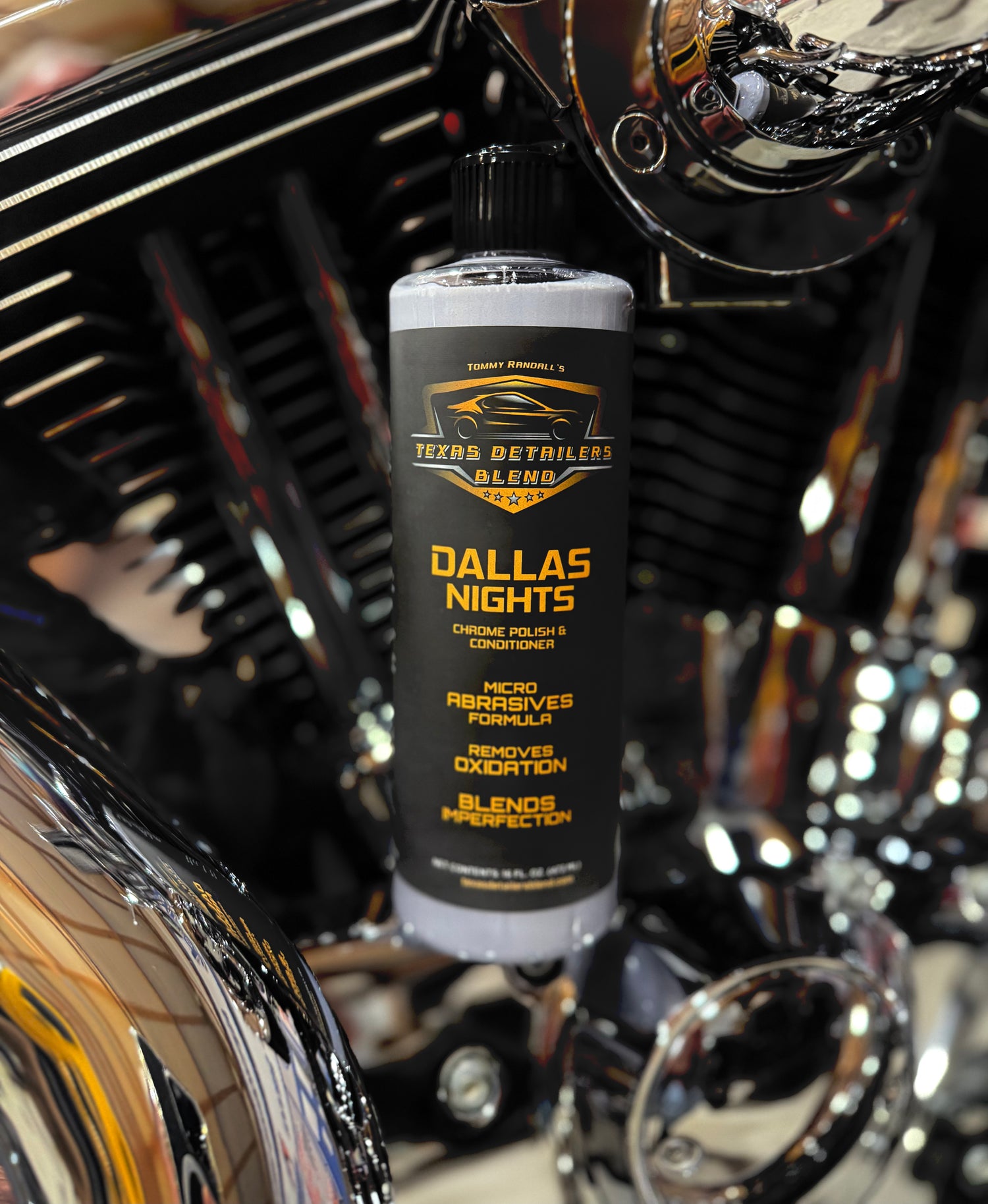 Bright and shiny, just like the Dallas skyline at night. Our Dallas Nights Chrome Conditioner and Polish is micro-abrasive wax formula that cleans chrome and leaves a long lasting shine. The micro abrasives not only remove oxidation stains but also blends chrome imperfections. The wax and synthetic fillers protect and condition your chrome and leave a rich bold luster. Excellent for bumpers, trim and chrome wheels. Hot Rod enthusiasts and Bikers have quickly become fans of Dallas Nights simply because it keeps their chrome parts and pipes shining while also removing stains. It gives you protection against dirt, road grime, pollution, UV light, and other contaminants.