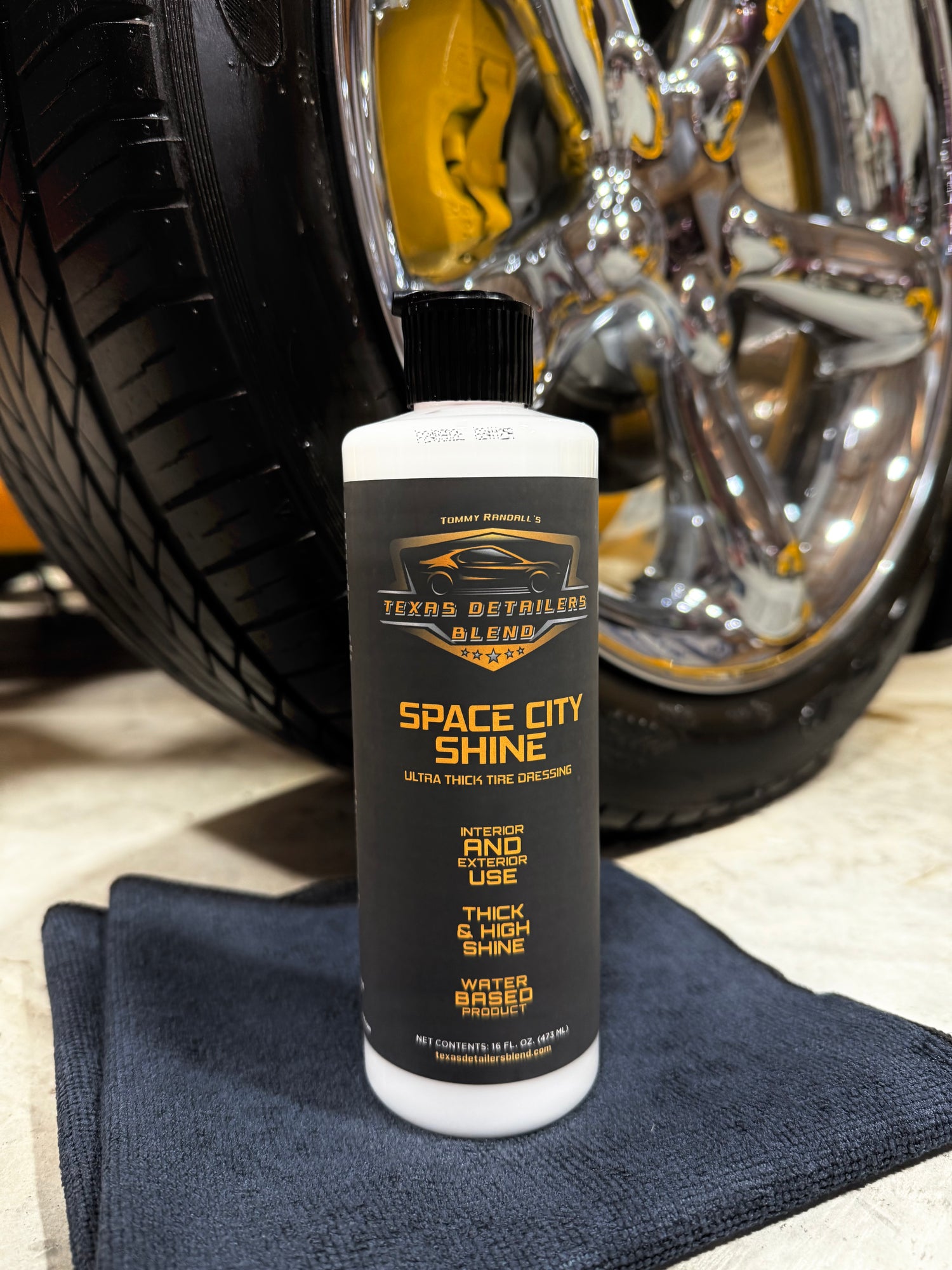 We developed Space City Shine to honor the Houston area's unique car culture and space age technological innovations. Space City Shine is our thick formulation of our water based dressing that can be used on tires, rubber, vinyl & plastic. Typically thick dressings are used with applicators or brushes (depending on the surface its being applied to) to avoid over-spray or sling. This is a high silicone, long lasting dressing that is widely considered as one of the best dressings on the market! Space City Shine will leave your surface conditioned, hydrated and free of any residue. Space City Shine is also fantastic for restoring faded plastics and is safe for use in the interior of the vehicle such as on your dashboard, doors, arm rests etc. This is a PREMIUM water based dressing that's versatile and long lasting, taking your tires and plastics to new heights!