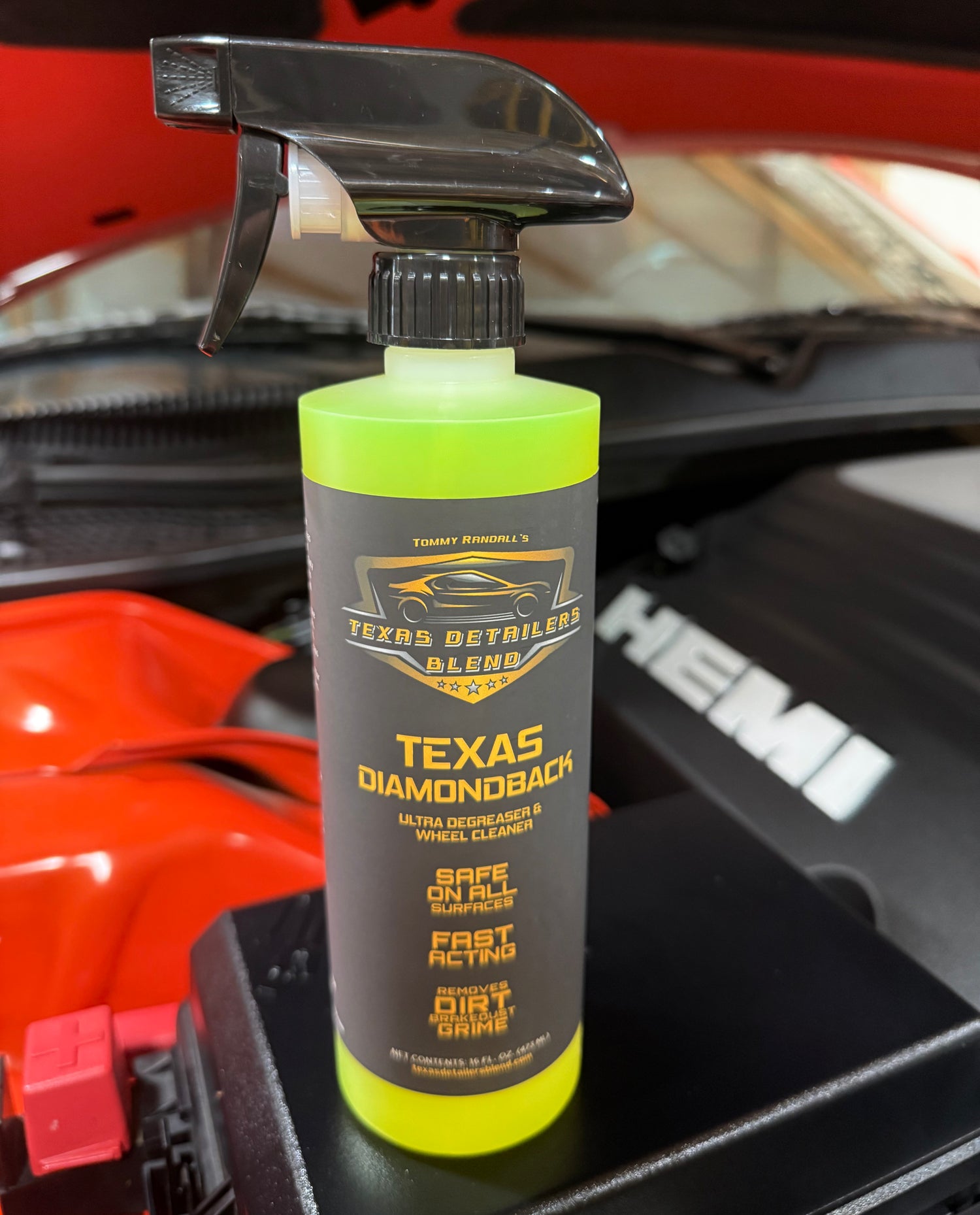 A Texas Diamondback rattlesnake strikes fast and hits hard with powerful and potent venom, just like our Texas Diamondback Ultra Degreaser and Wheel Cleaner. This degreaser is one of our most popular products due to its versatility in cleaning your vehicle from grime and dirt! Our Texas Diamondback Degreaser is ready to use to remove brake dust, grease and grime from tires, wheels, engine compartments, door jams, gas caps etc. It's also great for cleaning white wall tires. If further diluted this product can be used to safely clean seats, dashboards and door panels as a General Purpose Cleaner.
