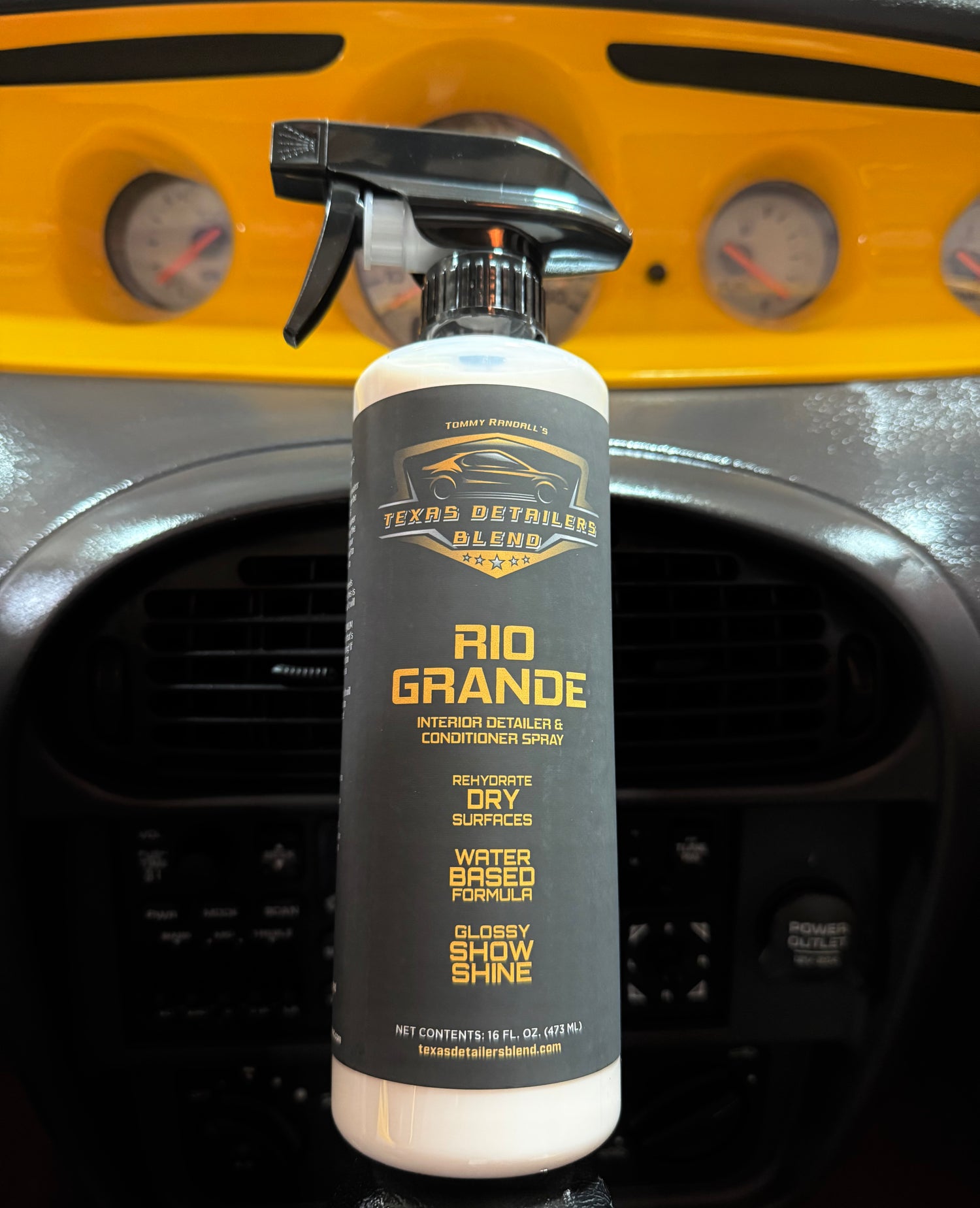Bringing hydration to the dry landscape of South and West Texas, the waters of the Rio Grande River bring life to our state. Our Rio Grande Interior Detailer & Conditioner Spray is a versatile sprayable formulation of our water based dressing that can be used bring life back to your rubber, vinyl & plastic. Rio Grande Interior Detailer & Conditioner Spray is ideal for conditioning the interior or exterior of your vehicle and can be used to give a hydrated shine to your tires, plastics, dashboard, interior panels and even seats. This is a PREMIUM water based dressing that's versatile and long lasting and will not dry or crack any surface! If you let this product sit on the surface it will give a great shine, if you immediately wipe dry, it will give a "like-new" look to your vehicle's surface!