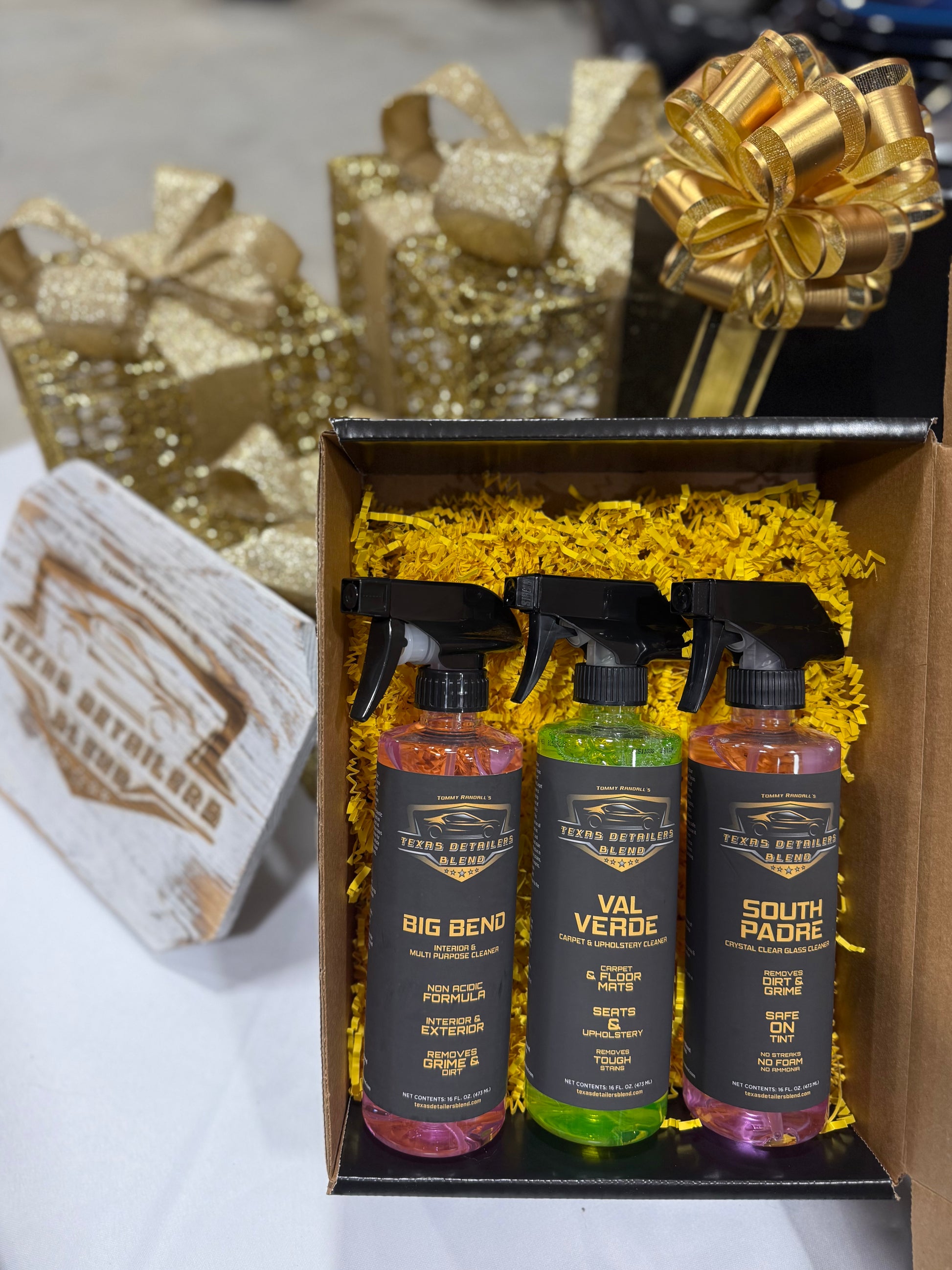 Need to get that interior cleaned before a final detail? Carpet and upholstery have spots & stains? Windows smudged, foggy & dirty? Grubby fingerprints on the dash & door panels? This is that deep cleaning kit that you need to start out with! Our new South Padre Crystal Clear Glass Cleaner will take care of all the interior and exterior glass, easily cleaning that inside windshield and getting rid of the dog slobber on the back windows. Then use our new Val Verde Carpet & Upholstery Cleaner to freshen up those seats, and clean the spots & stains from your carpet and carpeted floor mats. Then our Big Bend Interior & Multi Purpose Cleaner will get those door panels, steering wheel & handles, center consoles and that dirty dash clean and ready for our other Rio Grand Valley Interior Collection products. Comes with two Blackland Microfiber Towels and one Blackland Glass Towel all packed in a black gift box along with gold crinkle paper and a bow.