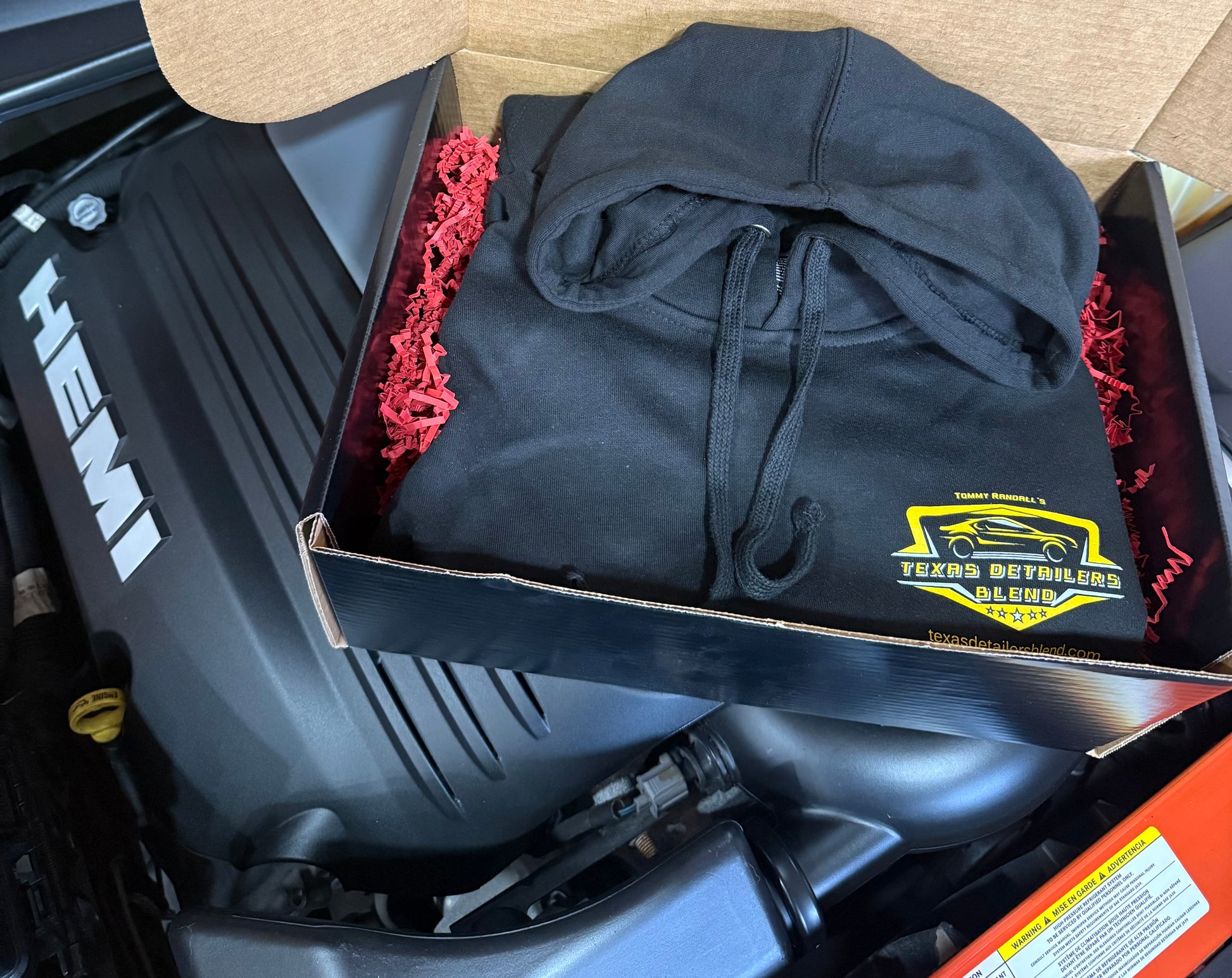 A Winter Gift idea for your detailing enthusiast! Includes a Texas Detailers Blend Logo Fleece Hoodie in the size you specify at checkout from Small to 3XL. Packed in our black gift box, with colored crinkle paper inside. You can also add detailing product bottles to the gift box!
