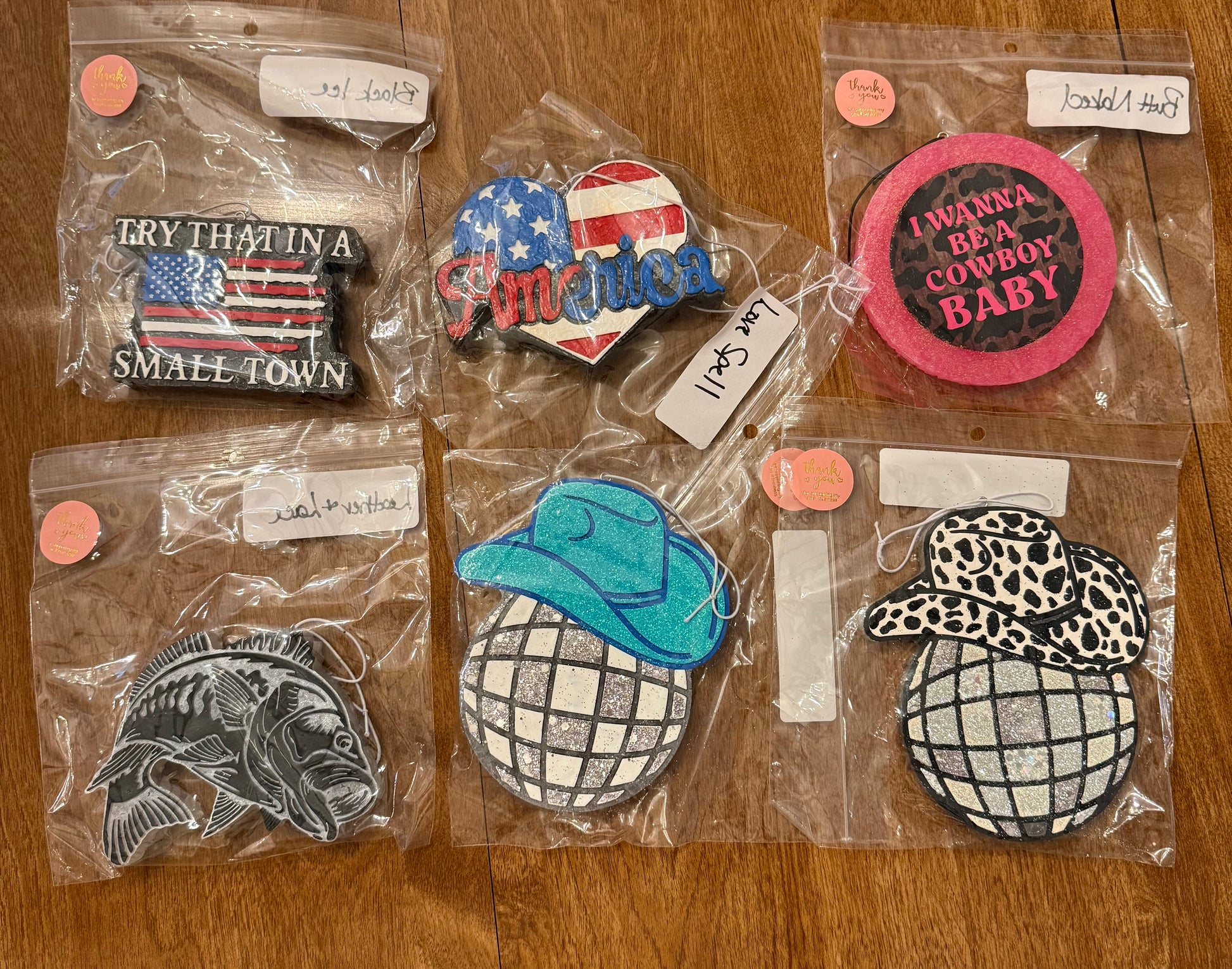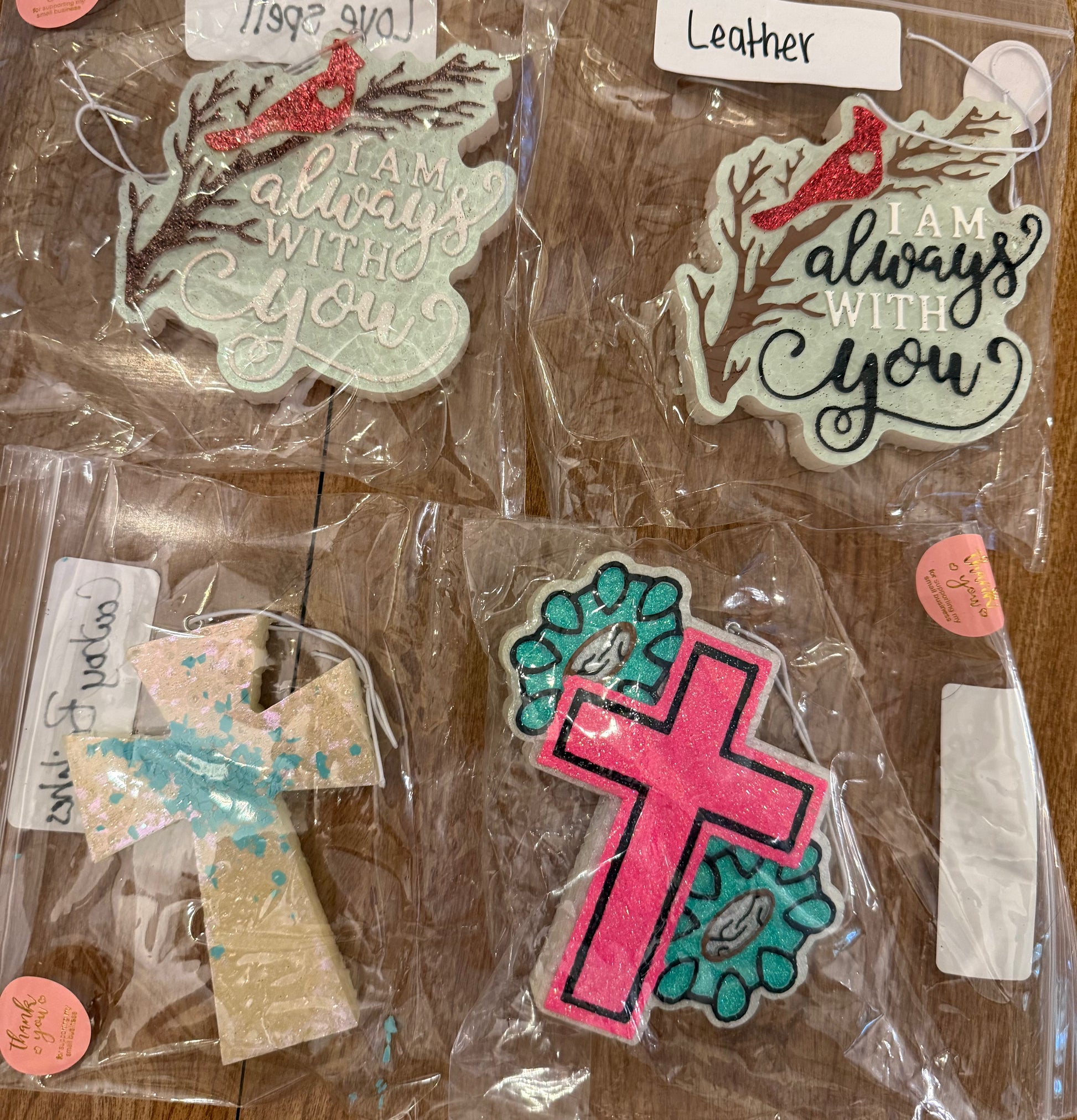 From our Family Partners at Rustic Arrow Creations, custom crafted scented freshies for your vehicle's interior. Several styles and scents are available, so if you see one that you like in these pictures and they are not listed as a purchase selection, send us an email and Destiny will custom make your Freshie with the colors and scents you desire.