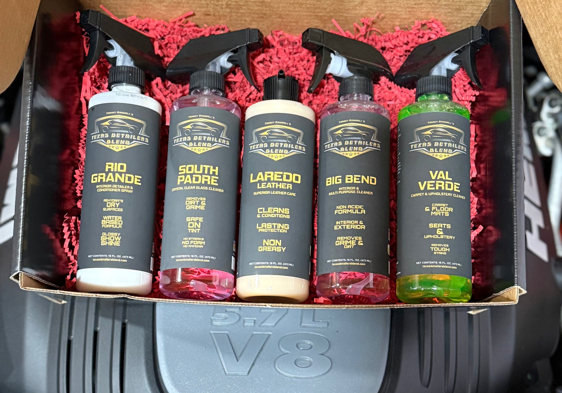 Our complete collection of Rio Grande Valley themed interior detailing products is now available as a full kit and Gift Box selection! Includes everything you need to care for the interior of your vehicle, along with applicators & towels. Begin with South Padre Crystal Clear Glass Cleaner to get those windows and windshield crystal clear. Next, use our Big Bend Interior Cleaner get rid of all that grime on those interior surfaces, including the dash, center console, door panels and especially that dirty steering wheel! Condition those surfaces with our Rio Grande Interior Detailer, leaving them glossy after application, or wipe down after a few minutes for a more factory matte finish. Then, clean your carpet along with those upholstery spots on seats & headliner with our Val Verde Carpet & Upholstery Cleaner. If you have leather seats instead, then finish up with Laredo Leather to make those surfaces look and smell like new leather again! Complete with 2 12x12 Blackland Glass Towels for use with South Padre, 2 Blackland Foam Applicators for use with Rio Grande and Laredo Leather, and a full 10 Pack of Blackland 16x16 Microfiber Towels for overall cleaning and conditioning, all washable & reuseable! Packed in a Gift Box for that special gift or to keep for yourself!